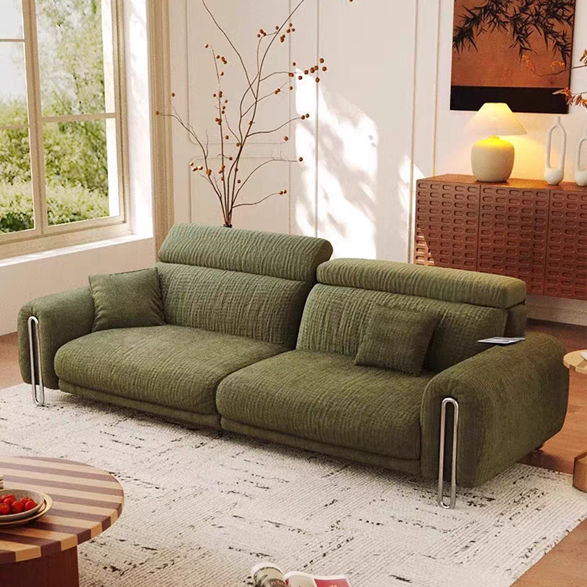 雪尼尔+实木框架+高回弹海绵+不锈钢底架+11分不锈钢扶手和脚(5档调节功能靠枕,头枕/靠枕/坐包面可拆洗)