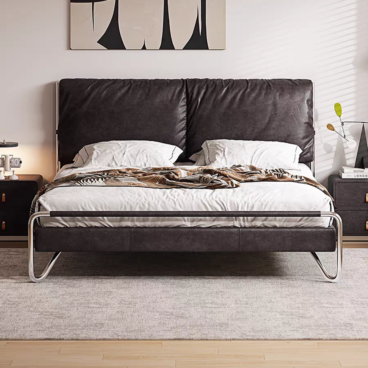 接触面头层真皮+实木内框+高密度海绵+羽绒+10公分钢木排骨架+不锈钢框架
