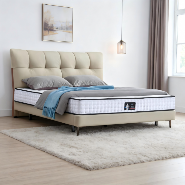 接触面头层真皮+全实木框架+高密度回弹海绵+15公分加密钢木排骨架+13公分碳素钢五金脚