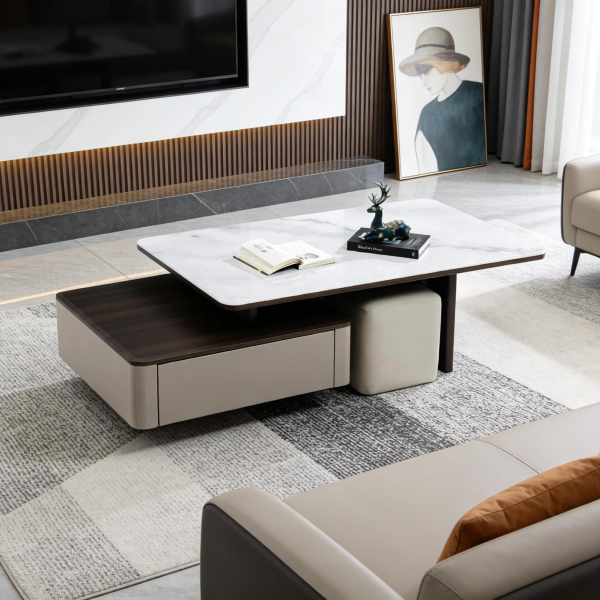 皎洁白玉微晶石可伸缩茶几/带凳子2个