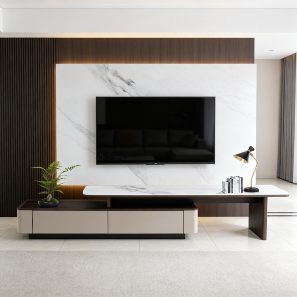 皎洁白玉微晶石台面+E1级板材贴科技皮+肤感膜柜体+抽屉环板板贴皮