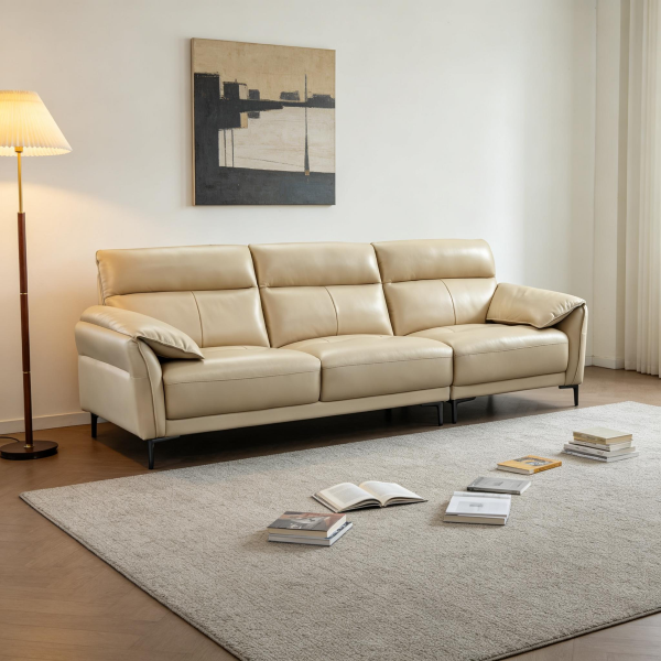 接触面头层真皮+高密度回弹海绵+实木内框+13公分五金脚