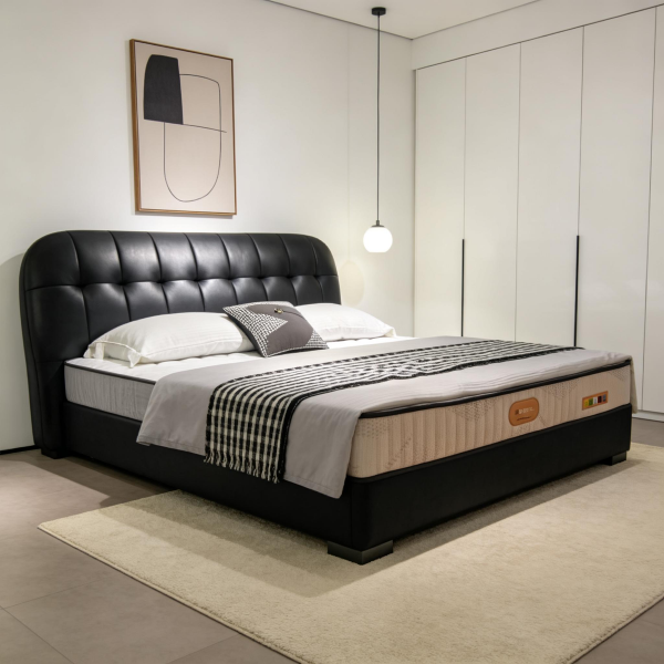 头层真皮接触面+海绵填充+10公分钢木排骨架+5公分实木脚