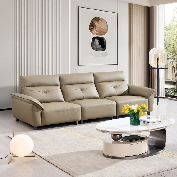 接触面中厚头层真皮+松木框架+无粉高密度回弹海绵+塑钢脚