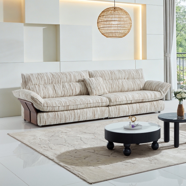 优选棉麻布配生态真皮+松木框架+无粉高密度回弹海绵+羽绒+实木扶手+塑钢脚