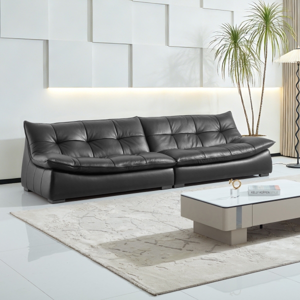 接触面中厚头层真皮+松木框架+无粉高密度回弹海绵+羽绒+塑钢脚