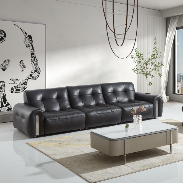 接触面中厚头层真皮+松木框架+无粉高密度回弹海绵+塑钢脚
