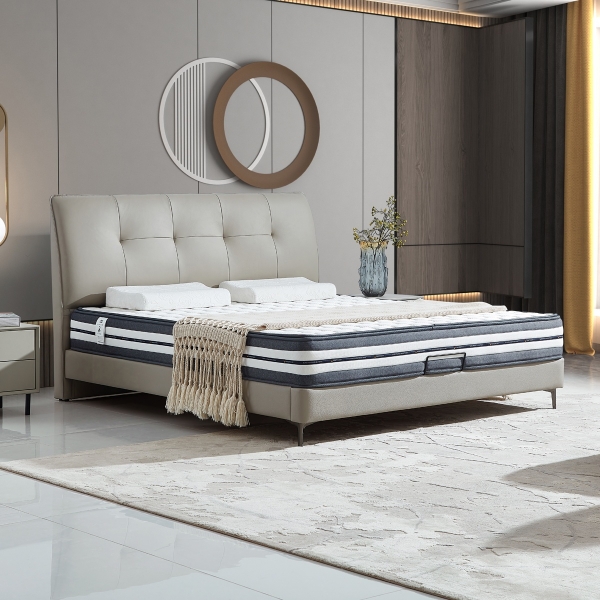 接触面头层黄牛皮+松木框架+无粉高密度回弹海绵+10分钢木排骨架+五金脚